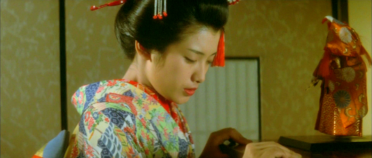 Doshomachi, Osaka,early Meiji era (c.1870s). Okoto (Momoe Yamaguchi), the youngest daughter of thewealthy owner of a wholesale medicine company, has lost her sight due to achildhood illness. She takes a liking to Sasuke (Tomokazu Miura), a youngapprentice employed by her father, and soon he is the only person she willallow to escort her to her music lessons and help her with other tasks. Okoto becomesproficient at playing the instrument whose name she shares (the koto, the ‘O’ being a polite prefix),inspiring the devoted Sasuke to take up the more humble samisen, which hepractises in secret.
