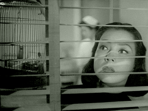 Having recently reviewed Shima’s The Beloved Image (1960), I can see some similarities between thetwo films – both star Machiko Kyo, both are adapted from serious works ofliterature, both make good use of weather, and both feature a number of shotswhich are clearly symbolic; in A Rainbowat Every Turn, Kyo’s face is deliberately obscured on a couple of occasionsby a sliding shoji, characters are separated at certain moments by a conveniently-placedpost or similar, and at one point a close-up of Kyo’s face through a venetianblind seems to be equating her situation to the caged bird featured in the sameshot. However, the devastating ending of TheBeloved Image is clearly not compromised at all, and I believe that it wasin that later film that Shima was able to achieve exactly what he wanted.