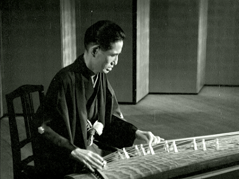 Even moreunconventional is the harpsichord score by Yasushi Akutagawa (son of Rashomon writer Ryunosuke Akutagawa!),which at times sounds like it's being played by a demented chimp. Weirdly, I kind of liked this too, andyou certainly can’t accuse anyone of going for the obvious here. Talking ofmusic, Nobuko and Ihara attend a kotoconcert around half an hour in, and the blind musician we see performing is quitesomething. He is Michio Miyagi (1894-1956), one of the all-time greats oftraditional Japanese music.*