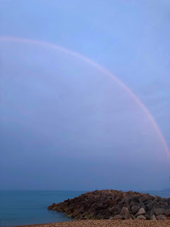 Last night I saw a pink rainbow, arching over the sea. It was dusk and threatening thunder. The approaching rain clouded the surface of the sea and blurred the horizon. Then the rainbow appeared, glowing pink against a dusky sky. I stood and watched until the sun set behind me, the rainbow dulled and the night closed in.