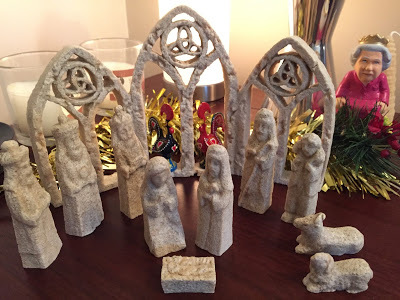 This is the Celtic nativity scene that my father gave me. I get it out every year and every so often I add to it. Note the caganer (Queen) crouching in the background - and this year two Portuguese cockerels...