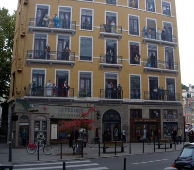 Lyon is the cpital of Europefor trompe l'oeil murals. There are more than 65 in the town itself and about 150 in the whole 'lyonnaise' conurbation. Here are a few of them I was delighted to see again when I went home during the Easter holidays.
