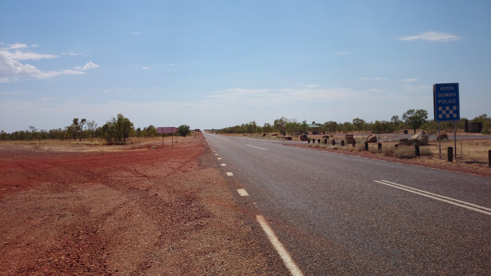 Avon Downs police station in the middle of nowhere.Day 2 we set of bright and early before the heat set in and began our journey well. We planned to cross the border into Queensland and reach Mt Isa in time for morning tea. Should have known all good plans always go astray. As the sun and heat rose and we cruised through the sweeping plains gazing at the wonder of the far horizon, we came around a sweeping bend in the road and over a “flood” bridge only to find a pot hole in the middle of the road almost the same size as our car. Too fast and too dangerous to swerve we hit the pot hole and hoped for the best. Sure enough we blew out the front right tyre. Not a problem! Just pull on over to the side of the road, unpack the bags from the boot, lift up the flap and look inside to where the spare tyre should be. Were my eyes deceiving me? We have a brand new car and NO spare tyre! Who would have thought? It may have seemed naive of both of us not to check before leaving Sarwin but we both assumed a new car would come equiped with a spare tyre! There we found ourselves in the middle of the outback, heat rising every minute, and not a soul in sight for miles. “Not to worry” said hubby, “I’ll wave down the next truck driver that comes along and get him to radio for help.”