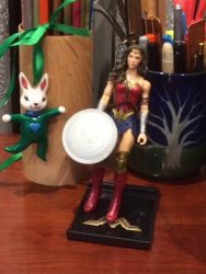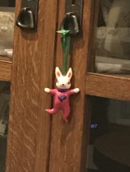 Pamela sent me my very own Accountability Bunny. I hung it on a cabinet door in my living room and see it when I write. It reminds me that there’s someone in it with me! Pamela has her accountability bunny and Wonder Woman on her desk.