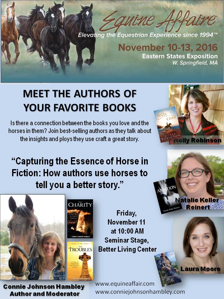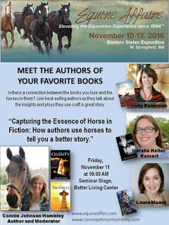 If you're in the Springfield, Massachusetts area November 11, stop by the Equine Affaire and hear Holly on a panel discussion of using the essence of the horse to bring readers a better story.