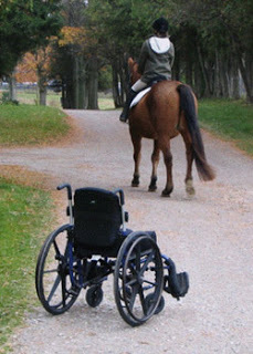 Exactly how that will happen is my challenge. This week I observed a riding class with individuals who have acquired injuries, meaning folks who lost function due to a traumatic injury or serious illness rather than someone born with a disability. I'm in awe of what sitting astride a horse can do for people. When a wheelchair-bound person can experience independence and mobility, something is going very right. I glimpsed how riders regain esteem. I was dumbfounded as I saw horses intuitively understand their riders communicated differently than a able-bodied rider and adapt to them.