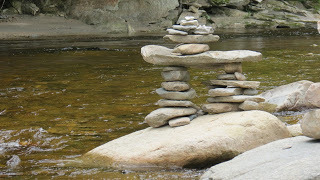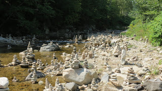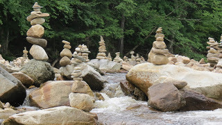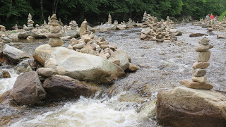 The dreaded iron fist of writer's block had me in its grip and I needed a change of pace. I was on my way to a self-imposed writer's retreat to spend an internet and phone free week, when I rounded the corner of Route 30 in Bondville,Vermont, a little before the Stratton access road. I was amazed at what I saw. In a bend of the river that runs along side the road were hundreds of small stone cairns. The stacks of washed white of the stones stood in stark contrast against the lush green of the forest behind them and the rushing river that surrounded them.
