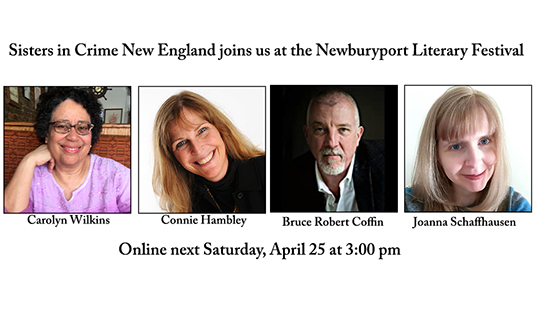 April 25, 2020, 3:00 pm via ZOOMPre-Register hereMystery Making with Sisters in Crime New EnglandNewburyport Literary Festival, Newburyport, MAGive a panel of talented authors names, setting, motives, weapon and more, then sit back and enjoy the fun as they create a brand new murder mystery on the spot! Join authors Joanna Schaffhausen, Bruce Robert Coffin, Carolyn Wilkins and Connie Johnson Hambley as they build a story while pulling back the curtain on the writing process! Special Note: This will be the first time our popular Mystery Making panel will be presented via video, no doubt adding to the fun for all!