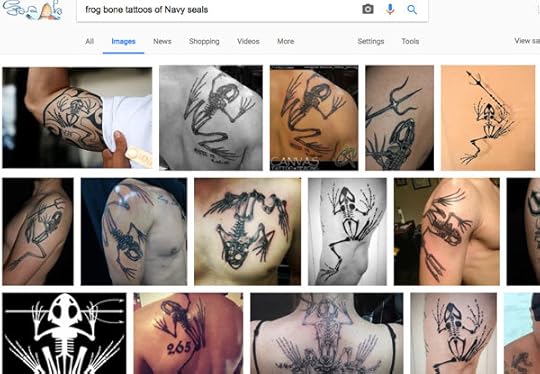 SEAL Frog Bone Tattoo: I decided against giving Eric a tattoo. I read a lot of blogs and articles about it. SEALs who may be captured or do clandestine work don’t want tattoos that could identify them as US military or special forces. Apparently a lot of guys who get the SEAL trident tattoo are fakers trying to make people (usually women they impress) think they are ex-SEALs. Some guys get the trident AFTER they are no longer active on operations. A tradition did start in 2005, apparently, of getting a skeleton of a frog (SEALs are “frogmen”/divers) tattooed if a SEAL in your platoon/squad/team dies, and overall the military are getting much more lenient about tattoos. If I write more books about Eric’s team, at least one of them will have the frog bone tattoo.