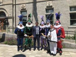 The city was also celebrating being twinned with the Belgium city of Namur—BIG shout out to Sophie! So, of course, there were bands, juggling, Fools dressed in costume and … CHOCOLATE! Yes, lots of it. Anyway, we almost died from heat-stroke, as it was 35 in the heat of the sun. But managed to find some shade in order to watch the “Fools” do their dance through the fountains.