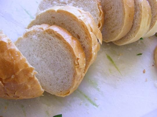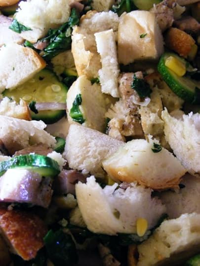 Remove veggies from heat and stir in bread, 1/2 cup of the cheese, and all the herbs.