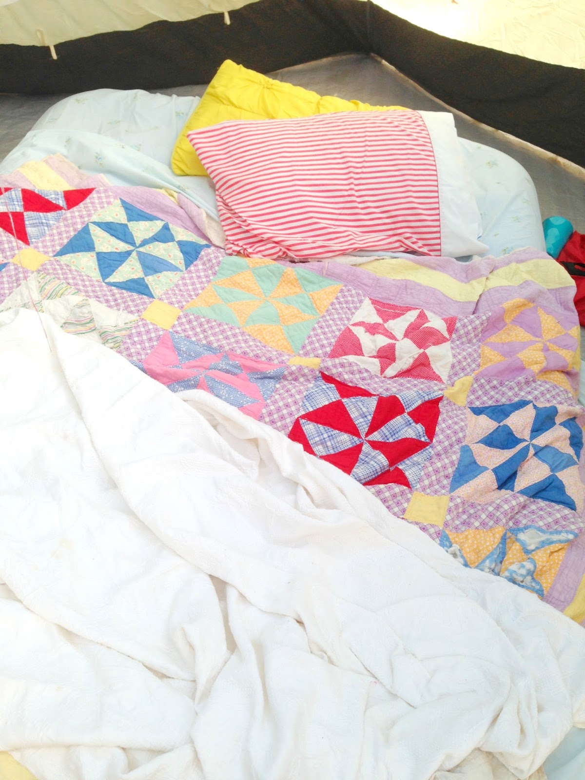 Almost a month ago, my friend Kim and I went to the hills of North Carolina for the Wild Goose Festival. This festival is held outdoors over the course of about four days, which meant camping. While we were there it rained. A lot. One day in particular I got caught in a downpour so heavy, I had to keep wiping sheets of rain out of my eyes in order to see. I also happen to have my stitching bag with me, which was completely soaked by the downpour. Since I was camping, and the rain was going to keep coming off and on, I had to find ways to lay out or string up all my scraps in the tent so they wouldn't mildew.