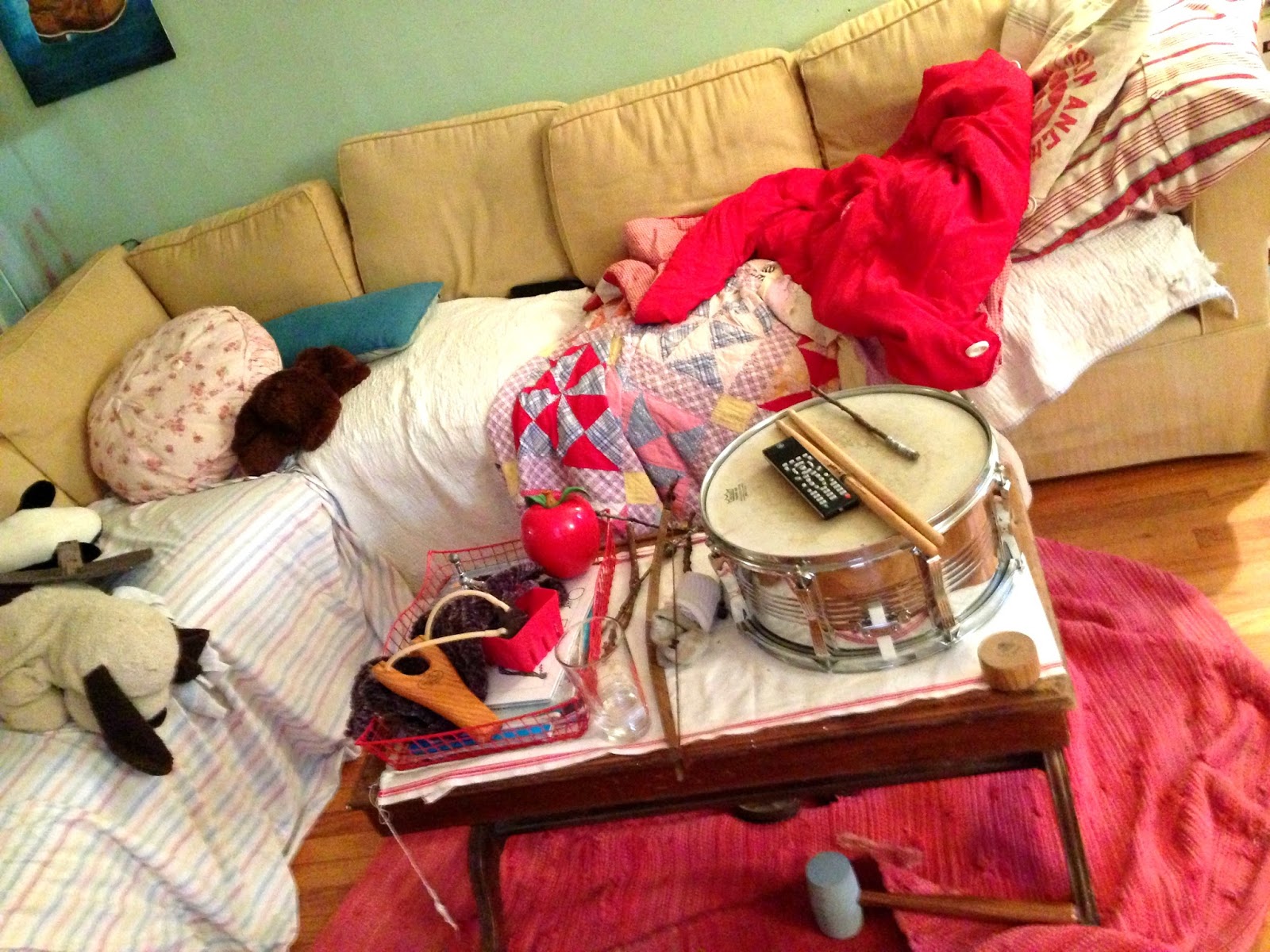 This is what our living room looked like the next morning and I can't help but wonder... Do all sleepovers involve snare drums, brooms, slingshots and mallets , among other wacky items?