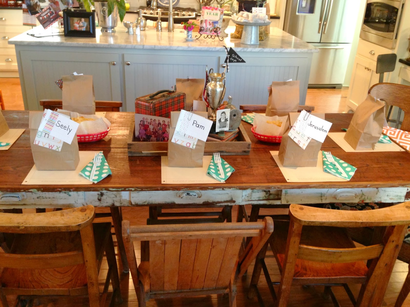 This past Monday night Jeanetta and I were invited to the home of Sarah Frost, one our of very favorite costumers from our Shoppe days, so that I could share the story of A Homemade Year with her and a group of her friends called the Doodles. We were invited to share the evening with this group of friends who meet once a month for dinner, sharing, occasional crafting and cooking and other various adventures. The eight gals take turn hosting and there is always a theme to the evening- which is often a surprise! Monday's theme was "Back to School." This was the perfect theme because a)School started for most districts in our area that day and b)Several of the gals are school teachers. Sarah herself just retired this year after 32 years teaching.