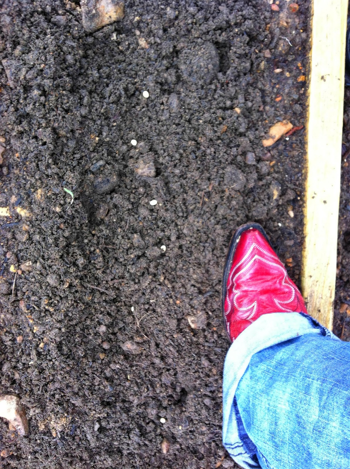 In addition to getting to bring some Edamame seeds home to plant in our own gardens, we got to plant some soy in Allen's 1 acre garden. Here Sarabeth demonstrates how to kick dirt over the seed using her fab red boot.