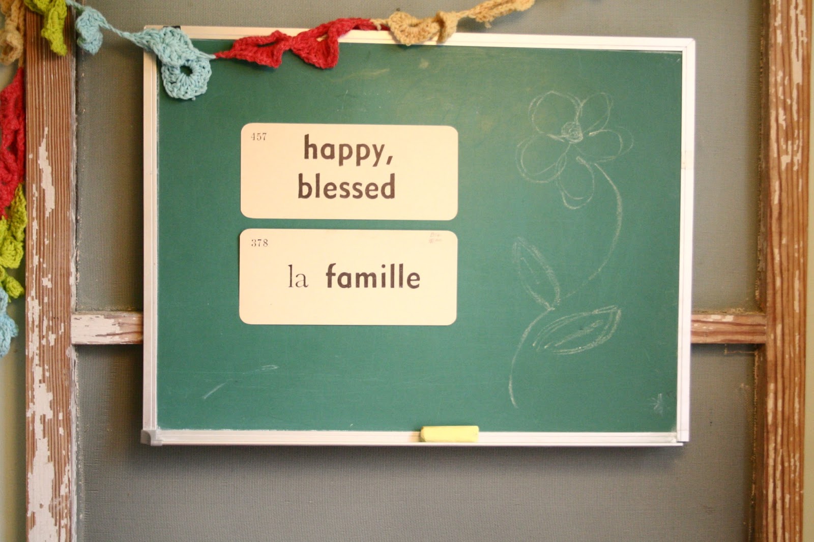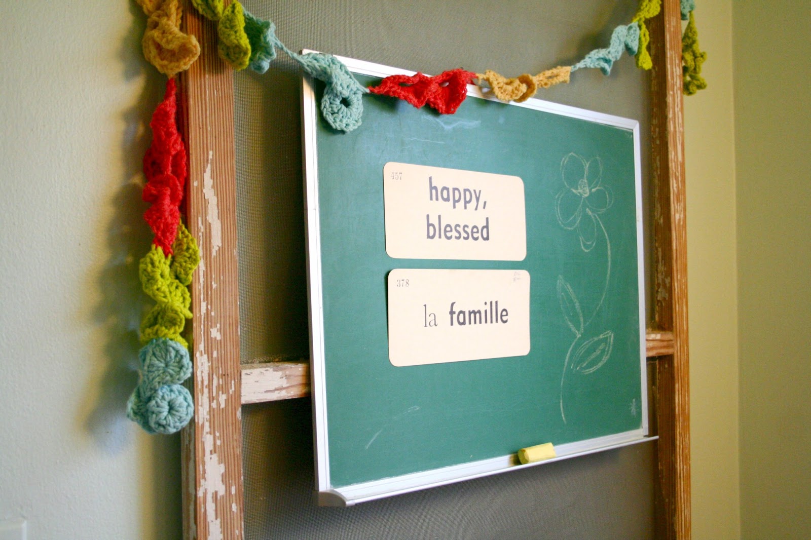 A vintage chalk-boardVintage french/english flash cardsFunky crochet garland