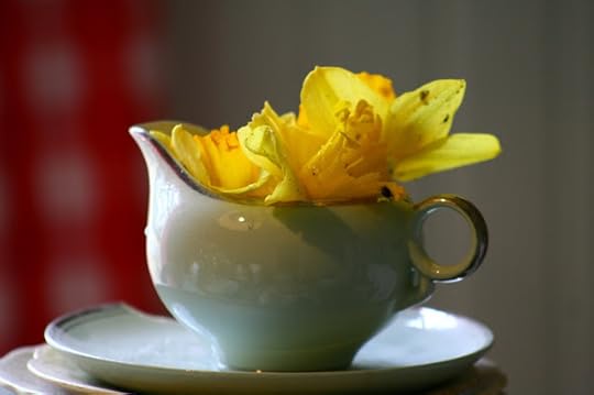 My first attempt EVER at gardening finally produced some flowers, which were swiftly beaten and pelted by the rain and sleet. I brought in the blooms that were broken and blown over and placed them in a little cream pitcher. They were covered in dirt and very windblown, but still their sunny disposition shone through. I am trying to take their approach to this weird turn of the weather.