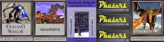 Welcome to the Stockade Brigade. All week, selected authors shall be put in the stockades and brought on trial for word witchery/wizardry. Witnesses shall score points by testifying for or against the author’s crimes. Points will be scored by wordsmithing with their best Olde English afore 8 o’clock in the Eastern time. An e-book from the author on trial will be given away every day to the witness who scores the most points. A pair of e-books by the Sheriff and a gift card to Amazon will be awarded at the end of the week. Warrants for their arrests have already been issued. The Sheriff of Realmsdom will catch up with them all soon.