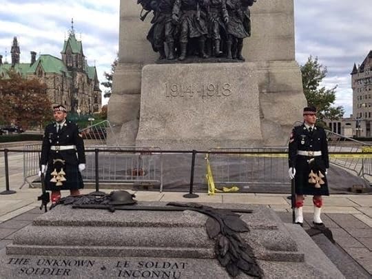 The following photo was taken just minutes before the incident. Wednesday morning, Cpl. Nathan Cirillo stood stoically in front of the National War Memorial standing guard over the tomb of the unknown soldier with his fellow guard. This is an honoured position. Two others were also injured during the shoot out.