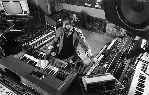 Vangelis composing on his synthesisers at Nemo Studios while looking at a film scene displayed on a video screen