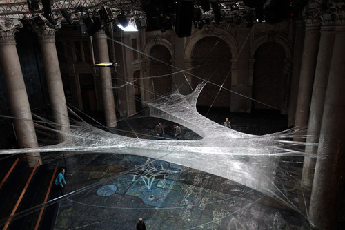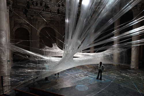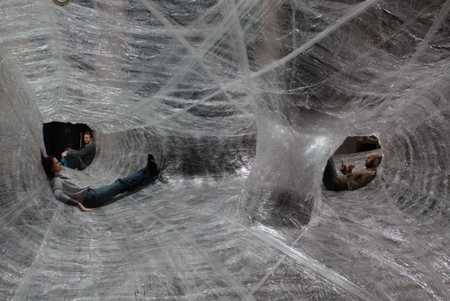 “The tape concept developed further towards a more sculptural architectonic form. It was practically “found” through the act of chaotic wrapping, where a one-dimensional line (“tape”), slowly turned into two-dimensional plane, which then finally curved into volume. The installation was envisaged as a site specific, parasitical structure invading an arbitrary location. The straight lines of main trajectories are stretched across a given area and these tendons are then wrapped diagonally with layers of elastic tape, giving shape to a complex organic form through a process similar to the emergence of such structures in nature. With the further layering of the tape, the figure becomes more and more corporeal as it picks up on the slow increase of the curvature. The interior of the structure is supple, elastic, and pliable while the form itself is statically perfect, as it ideally follows the trajectories of forces, being literally defined by them. In the moment when the audience enters the installation, what started off as a sculpture seamlessly morphs into architecture.”