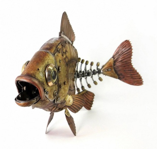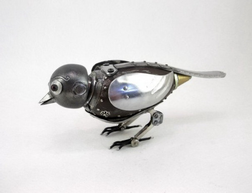 Artist Igor Verniy assembles stunningly detailed, steampunk-infused animal sculptures out of discarded metal, car and bike parts, watch components, electronics, silverware, and other metal scraps.