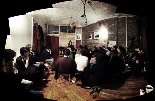 Last night at Seeds::Brooklyn: That’s Carmiel Banasky on the front stage. On the front row, you may recognize the backs of the head of the lovely Catherine Chung and Nick Dybek (respectively) and that’s me on the left, protecting the coats