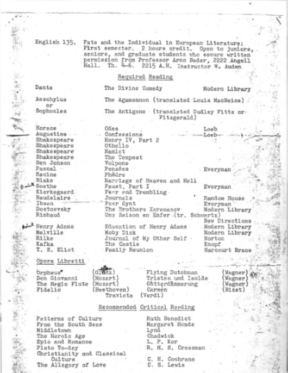 W.H. Auden’s syllabus (yes, for a single semester) for a class called “Fate and the Individual in European Culture” at the University of Michigan. This is not a course to be trifled with.