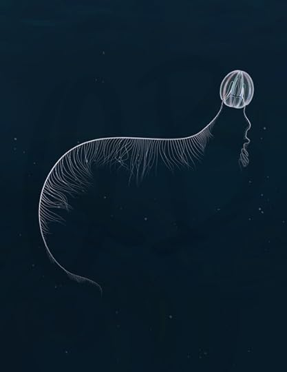 Illustration of the feeding mechanism of the sea gooseberry. When relaxed its tentacles expand, acting like a spider’s web to capture prey. Instead of stinging cells, these tentacles are lined with special adhesive cells to prevent prey from escaping.