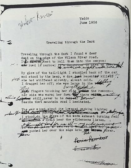 His son Kim included the following note: “He wrote the poem at Yaddo, then sent it to many magazines. The Paris Review is one of almost a dozen who rejected what eventually became the title poem in his collection, Traveling Through the Dark, which won the National Book Award in 1962. I believe my father would have enjoyed the irony, as I hope you do, of this poem appearing in this form in Paris Review lo these thirty-five years later.”