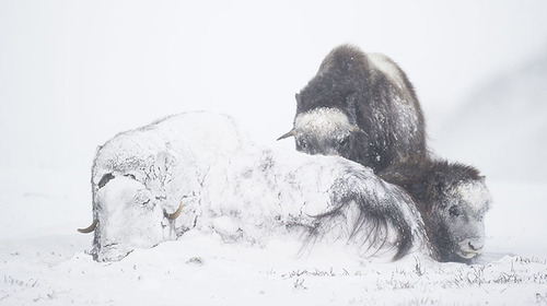 After 30 minutes in a blizzard this female musk ox was completely snowed in, with her calf and a youngster finding shelter behind her in -25C and gale force winds at Dovrefjell national park, Norway