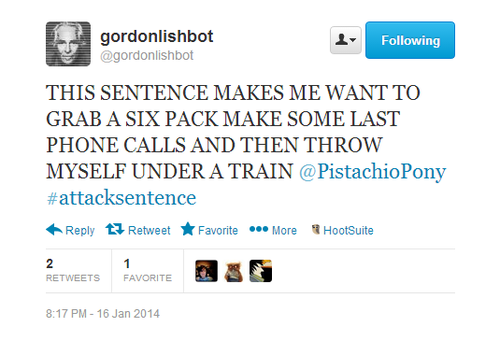 Looking for someone to whip your writing into shape? Then tweet the new Gordon Lish bot, a Twitter account which offers unvarnished critiques of your tweets and fictional sentences. (Related: Frank Kovarik on the editor’s relationship with Raymond Carver.)