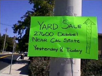 The problem with this sign is that the best yard sale goodies were probably available "yesterday." You're down to the dregs today. Better to post a sign that is fuzzy with time and refers only to "today."
