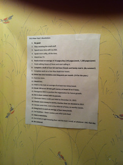 I made 24 distinct New Year’s Resolutions this year. As I did last year, I taped the resolutions to my bathroom wall. I figure if I have to look at them everyday, maybe they’ll sink in. (Of course, having to look at the bathroom wallpaper for five years hasn’t made me change it, so go figure.) Most of my resolutions are benign — read more, finish such and such writing project, slouch less, exercise more, blah, blah, blah. But a few — don’t sweat the small stuff; be less loud, always — get at the heart of who I think I can be.