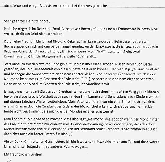 An die Verfasserin des Briefes: Es tut mir aufrichtig leid, solchen Mist gebaut zu haben. Allerdings finde ich so was wie "der Mondes steht in seinem eigenen Schatten" auch nicht so dolle. Wegen solcher Aussagen habe ich in Physik zuletzt nur noch gepennt. "Bei Neumond steht der Mond haargenau zwischen Erde und Sonne", finde ich nachvollziehbarer. Es ist so einfach. Oskar hätte das wissen müssen, aber - hey: Vielleicht ... ja, genau ... vielleicht hab ich die Szene nur so geschrieben, damit findige Leser Oskar mal beim Bluffen erwischen!