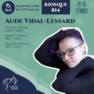 J'aurai le grand plaisir d'y être à partir de vendredi, au kiosque des Éditions Luzerne Rousse. Vous pourrez vous y procurer toute la trilogie Si les étoiles s'alignent et obtenir une dédicace. De plus, si vous désirez compléter vos séries Polux ou Panthera, ou mettre la main sur le tome 1 de Sang et poussière, vous pouvez me contacter en privé (aude-vidal-lessard@hotmail.fr) afin de réserver une copie. Je vous rappelle que mes premières séries ne sont désormais plus disponibles en librairies. Sang et poussière reverra toutefois bientôt le jour sous forme d'auto-édition. Date et détails à venir...