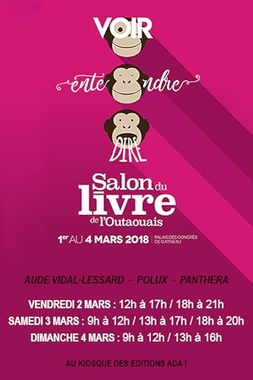 Venez en grand nombre! Il s'agira de mon dernier Salon de la saison, après quoi vous me retrouverez pour le Salon du Livre de l'Estrie! Avec un nouveau livre... ou deux. Ou trois. ;)