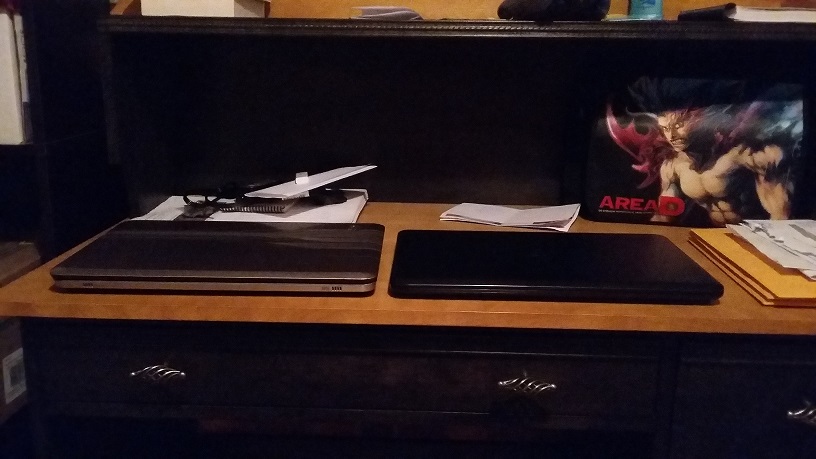 À gauche, Brave-Bête, première génération. Fidèle ordinateur de votre auteure préférée pendant 5 longues années. Il aura connu des dizaines de personnages et d'aventures toutes plus périlleuses les unes que les autres; certaines mettant en vedette vos héros favoris, tels que Polux et Tara, d'autres des protagonistes que vous ne connaissez pas encore (rendez-vous au mois de novembre pour la parution de Panthera 1 et 2!); et d'autres encore, lui-même! En effet, Brave-Bête aura, au cours de sa longue (?) vie, affronté des batteries déchargées, un virus, plus d'une surchauffe, un roadtrip dans le sud des États-Unis et plusieurs visites chez le réparateur. Il prend maintenant une retraite bien méritée, à l'abri de la poussière et des poils de chat.