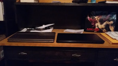 À droite, Brave-Bête, seconde génération : Mini. Nouvelle machine portable de votre auteure préférée. Comme pour son prédécesseur avant lui, une foule de péripéties attendent Mini et, avec un peu de chance, des plus excitantes. Pour introduire Mini à sa nouvelle vie, quoi de mieux qu'une séance d'écriture dans le monde post-apocalyptique de H&E1 ? Oui, je me le demande aussi!