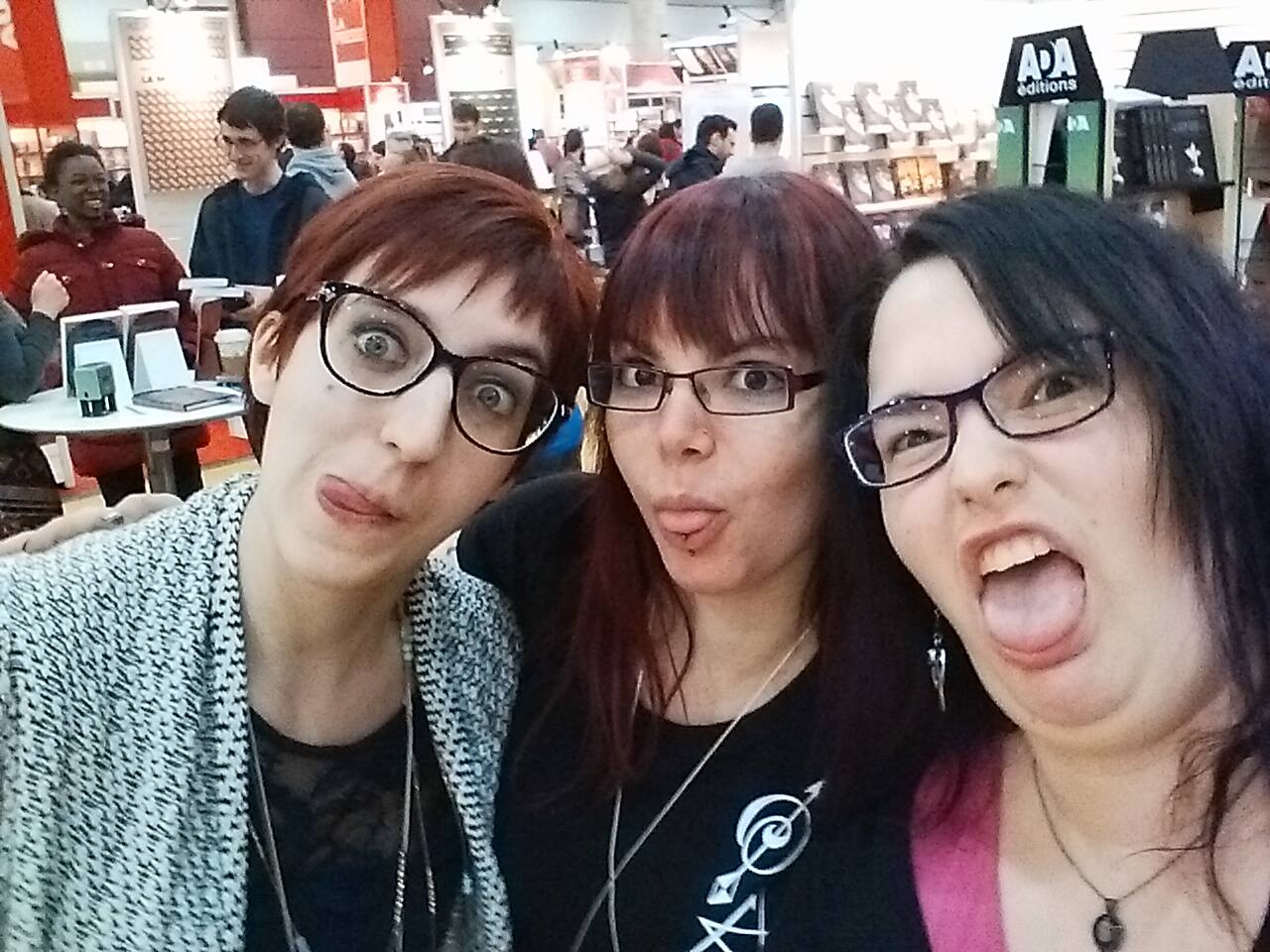 En ordre à partir de la gauche : votre auteure préférée, le booktuber Max (carrément aussi adorable qu'Élodie et son accent!), Élodie Loiselle et Élisabeth Camirand.