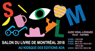 J'ai le grand plaisir de vous annoncer que je serai, comme toujours, présente au Salon du Livre de Montréal, qui se tiendra du 14 au 19 novembre prochain. Vous pourrez me trouver, moi ainsi qu'une foule d'autres auteurs bien sympa, au kiosque des Éditions AdA aux dates et heures suivantes :