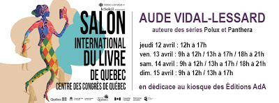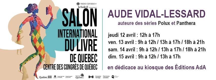 Comme à chaque année, je serai présente au Salon International du Livre de Québec, pour des séances de dédicace au kiosque des Éditions AdA! Vous voulez faire dédicacer un (ou plusieurs) de vos exemplaires de Polux ou de Panthera? Vous avez des questions sur mes prochains projets? Vous voulez prendre un ego-portrait (selfie) avec votre auteure préférée (oui, je parle de moi)? Je serai là pour ça!!