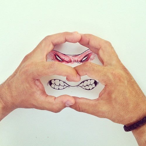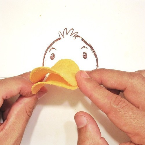 Chicago-based artist Alex Solis creates simple drawings that turn into awesome finished pieces with the incorporation of his own hands and/or other ordinary objects, like potato chips or fruit. He brings his drawings to life by appearing to interact with them.