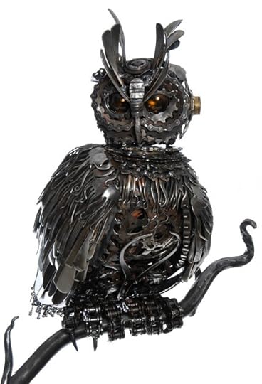 Steampunk Eagle Owl made from cutlery, motorbike, and bicycle parts. Mounted on driftwood and forged steel branch. By Alan Williams