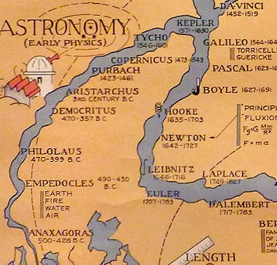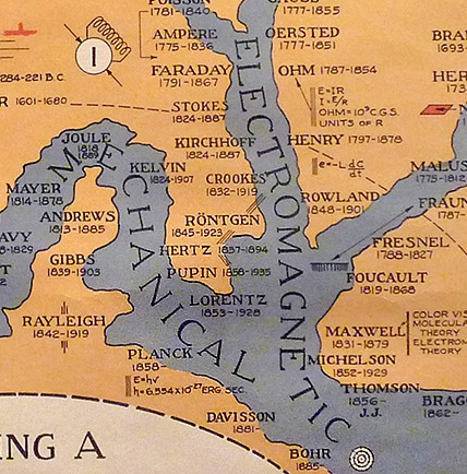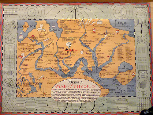 A 1939 map of physics, which lays out famous physicists and their fields of study, including: Mechanics, Sound, Electricity, Magnetism, Light, Astronomy, Heat, Mechanical and Elecromagnetic Energy, and Radioactivity. Check out the text under the Darkness peninsula: