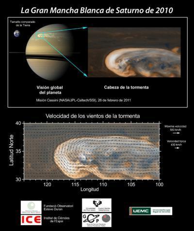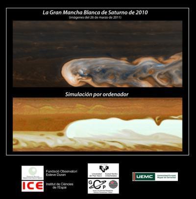 The research [the Planetary Sciences Group of the University of the Basque Country] revealed the mechanism that produces this phenomenology. The team of scientists designed mathematical models capable of reproducing the storm on a computer, providing a physical explanation for the behaviour of this giant storm and for its lengthy duration. The calculations show that the focus of the storm is deeply embedded, some 300 km above the visible clouds. The storm transports enormous quantities of moist gas in water vapour to the highest levels of the planet, forming visible clouds and liberating enormous quantities of energy. This injection of energy interacts violently with the dominant wind of Saturn to produce wind storms of 500 km/h. The research also showed that, despite the enormous activity of the storm, this was not able to substantially modify the prevailing winds which blow permanently in the same direction as the Earth’s parallels, but they did interact violently with them…