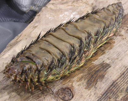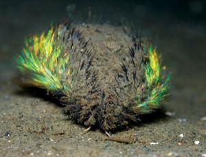 The segmented structure of the sea mouse (Aphrodita aculeata), a kind of polycheate worm, can be seen only if it is turned over because its back is disguised by a thick felt of hairs that mask its segments. Running along each side of its body are numerous stiff, black bristles and a fringe of beautiful, iridescent hairs that glow green, blue, or yellow. The bristles can cause severe irritation if they puncture the skin. The sea mouse is so called because it looks like a bedraggled mouse when washed up dead on the shore.