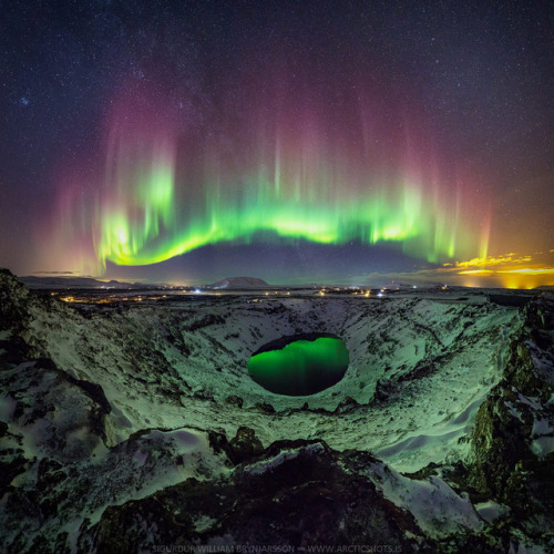 Today the Department of Awesome Natural Wonders is spellbound by this dazzling photo taken by Icelandic photographer Sigurður William. While camping along the edge of the Kerið volcanic crate lake in southern Iceland William captured this spectacular shot of the Northern lights and starry sky reflected on the lake’s surface.