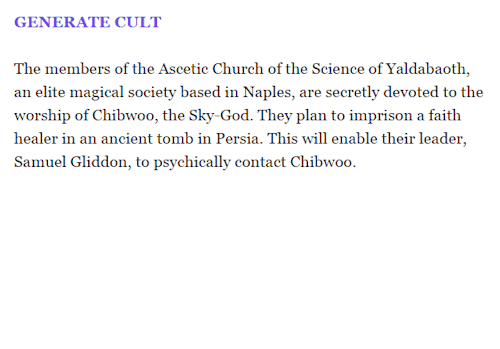 I can think of numerous applications for a procedural cult generator. Maybe you need a group to summon a procedurally generated demon, or maybe your Trail of Cthulhu campaign could use help with plot inspiration.