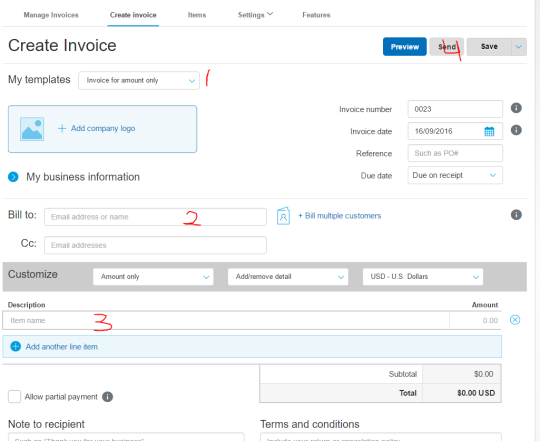 Optional steps. Create a template, doesn’t take more than 10 minutes and it will save you a lot of time for future invoices, you can even click on “items” right next to “create invoice” and add a list of services you offer such as “character sketch” “character flats” along with a price, so next time you invoice you just add to the invoice from your list of items and you saved yourself some more time.